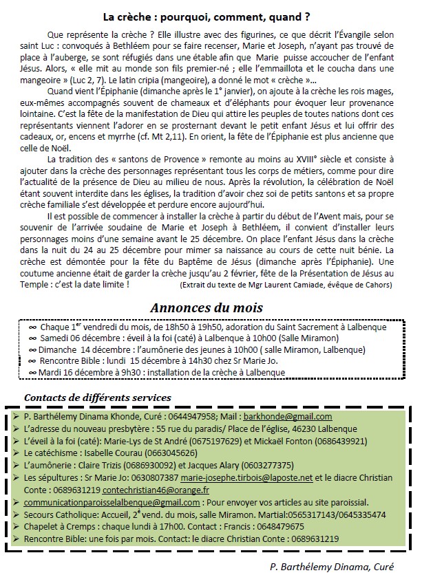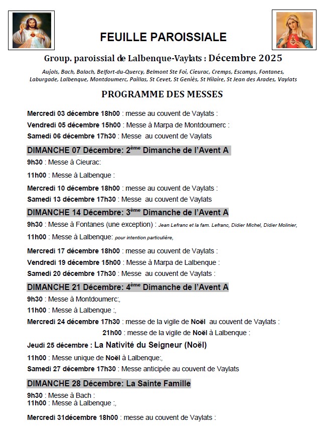 Programme des messes du mois de décembre