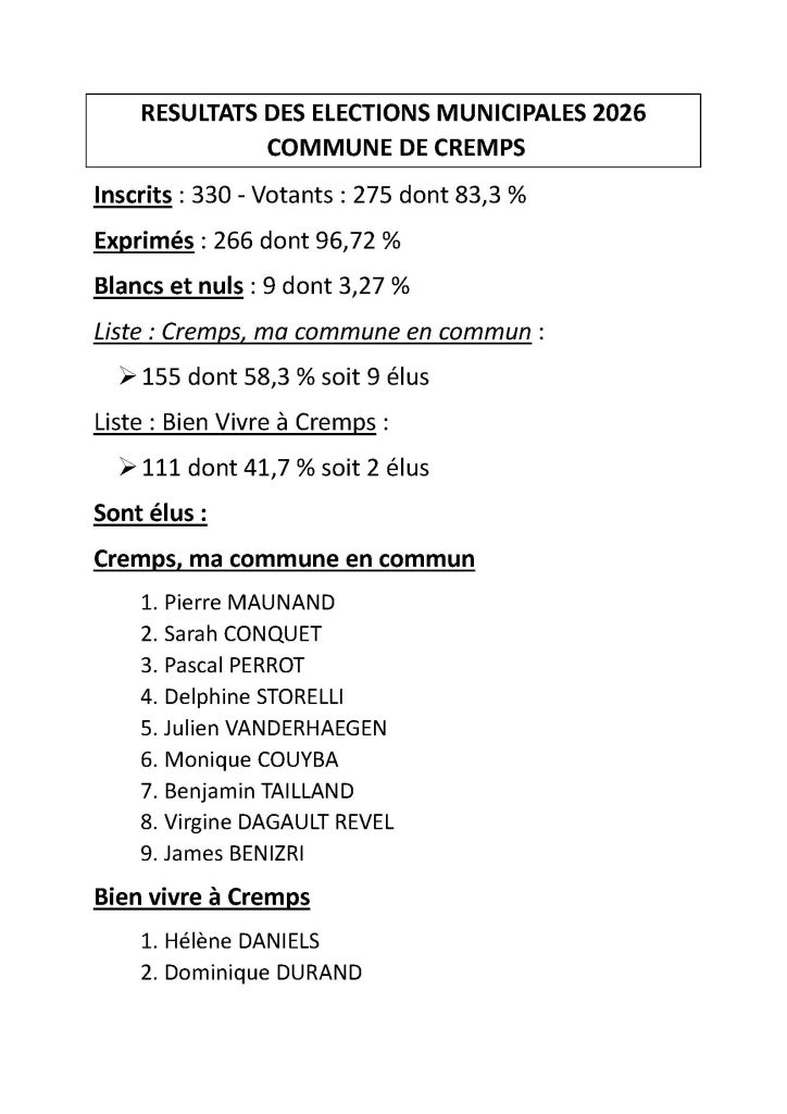 RESULTATS DES ELECTIONS MUNICIPALES 2026 – COMMUNE DE CREMPS
