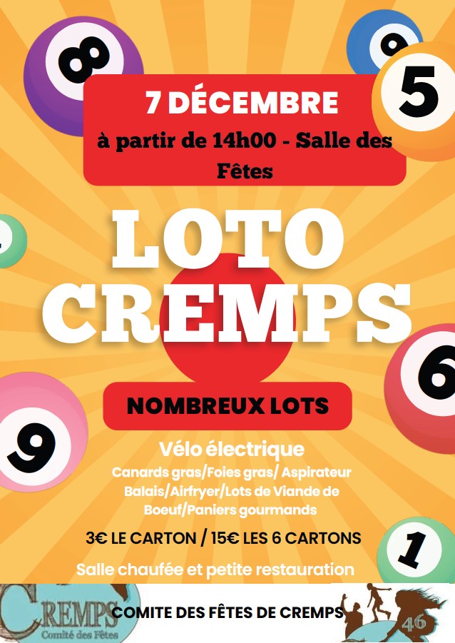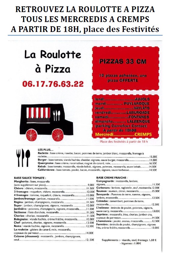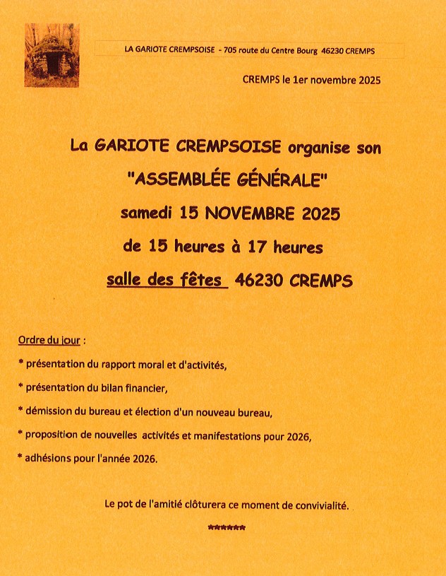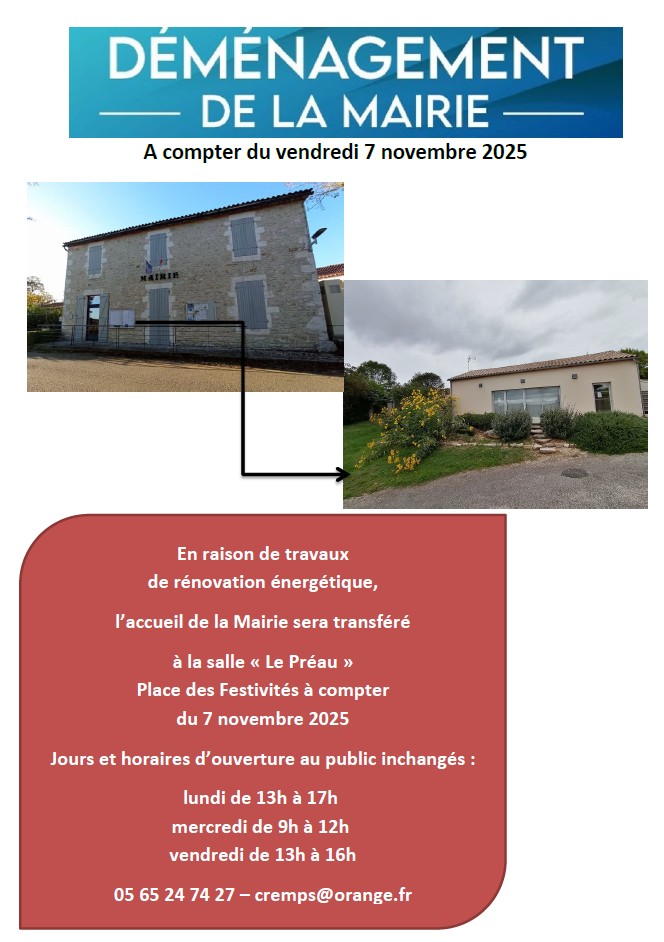 Le secrétariat de la mairie de Cremps sera exceptionnellement fermé : du 27 octobre au 02 novembre 2025 En cas d’urgence s’adresser au maire ou aux adjoints